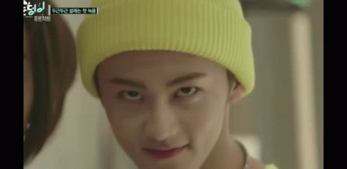 Mark Lee in a yellow beanie gives an intense, smirking glare to the camera during a "heart-thumping first recording."