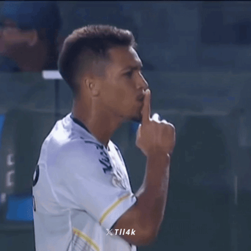 Marcos Leonardo, Al-Hilal player, makes a 'shush' gesture to the crowd during a soccer match.