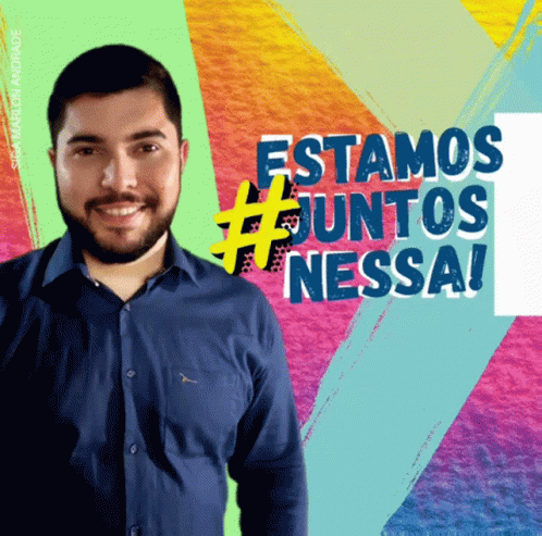 Marlon Andrade smiles in front of a vibrant background, sharing the message 'Estamos Juntos Nessa!' (We're All In This Together).