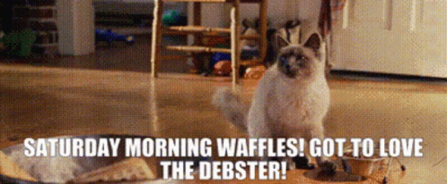 Marmaduke, the Great Dane, eagerly enjoys a plate of Saturday morning waffles.