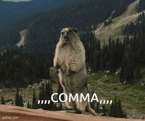 A marmot stands on its hind legs in a mountain landscape, appearing to yell the word 'COMMA'.