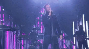 Maroon 5's lead singer performs live on stage, singing into a microphone amidst vibrant purple lights.