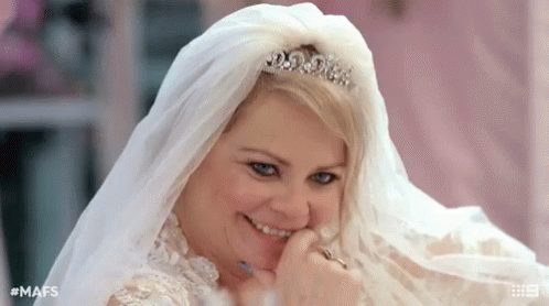 A happy bride from Married At First Sight smiles brightly in her wedding dress and tiara.