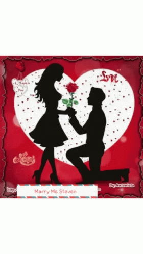 A romantic silhouette graphic depicts a man kneeling, offering a rose to a woman, symbolizing a marriage proposal.