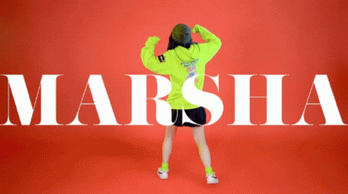 Marsha Lenathea of JKT48 performs a vibrant dance in a neon green hoodie against an orange background.