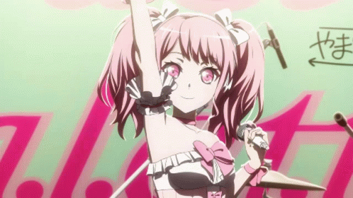Maruyama Aya, an anime girl with pink pigtails, sings into a microphone and waves to the audience.