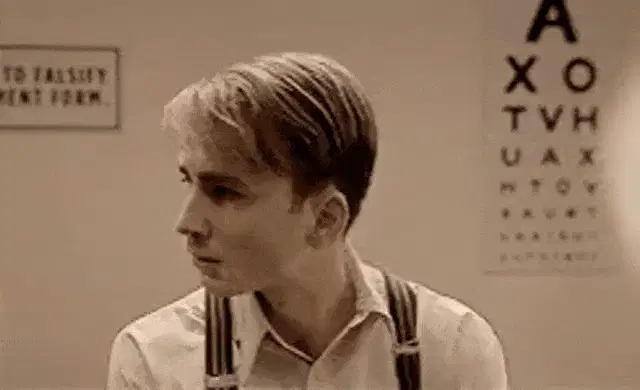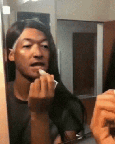 Maruyama, a man with long hair, applies lip balm in front of a mirror, then looks intently at the camera.
