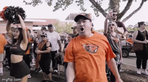 Superfan Marvin Beaverman enthusiastically cheers for the Oregon State Beavers, surrounded by fellow fans and a cheerleader.