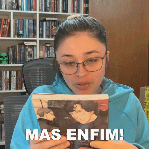 Joice Cardoso holds up a book, displaying the phrase 'Mas Enfim!' on the cover.