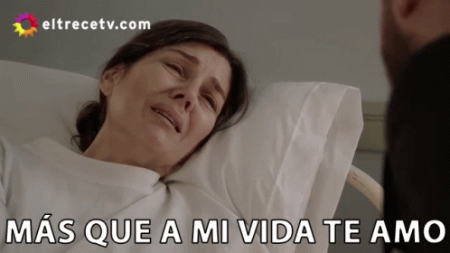Andrea Frigerio as Madame Ivonne, teary-eyed in a hospital bed, expressing deep love. From Argentina Tierra De Amor Y Venganza.