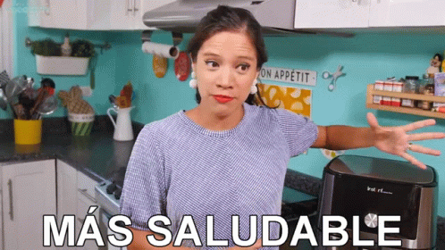 La Cooquette highlights a 'more healthy' option with peace signs in her kitchen, featuring the text 'MÁS SALUDABLE'.