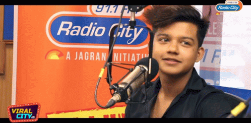 Riyaz Aly smiles and grins during an appearance at Radio City, wearing a black shirt.