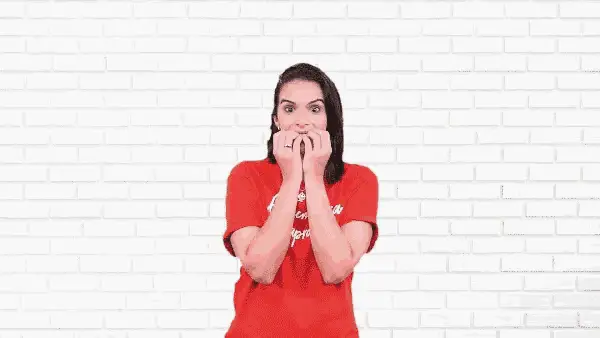 A woman chews gum nervously, her eyes wide with a suspicious and anxious expression.