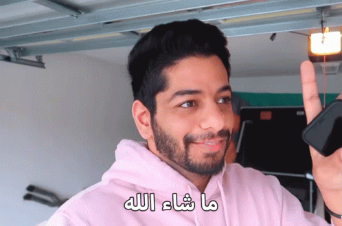Ali Al-Baloushi in a pink hoodie, smiling and gesturing with a phone, expressing 'Masha'Allah'.