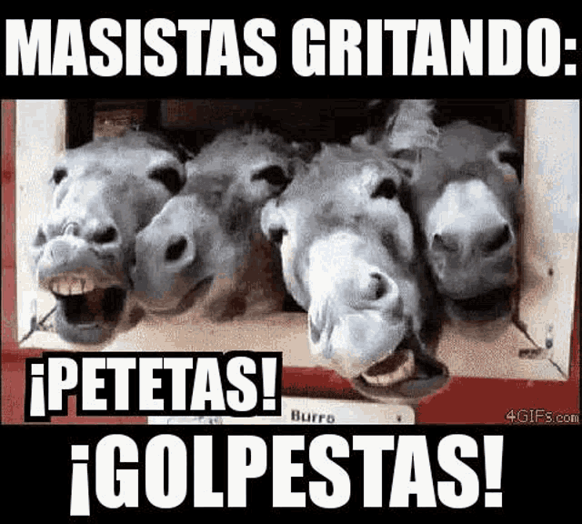 Masistas Gritando meme with donkeys shouting "¡Petetas! ¡Golpestas!", satirizing political supporters.