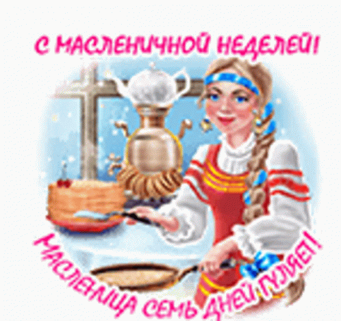 A cheerful woman in traditional Russian attire cooks blini for Maslenitsa, celebrating the Butter Week.