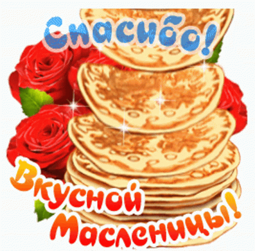 Animated greeting for Maslenitsa with pancakes, red caviar, and red roses, wishing a 'Happy Maslenitsa!'