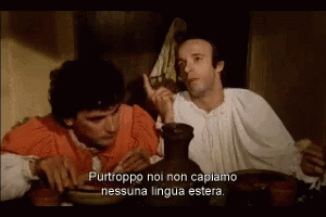 Massimo Troisi and Roberto Benigni at a table, discussing not understanding foreign languages.