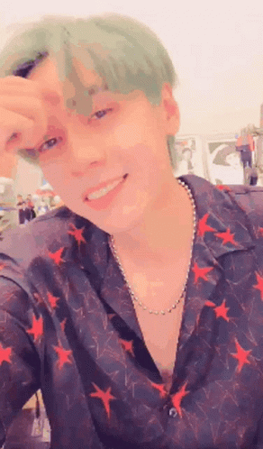 Master D Quang Hung smiles charmingly, touching his green hair while wearing a star-patterned shirt and necklace.