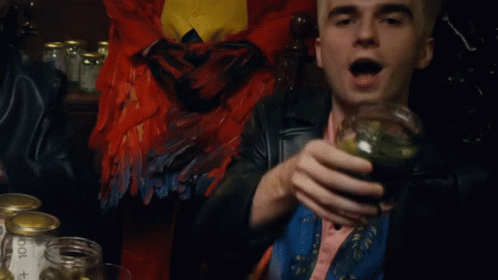 Polish rapper Mata in his 'Mata Ogórek' music video, holding a jar labeled '100' with a parrot costume in the background.