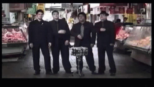 Four men in black suits and ties stand dramatically in a meat market, with a drum, reflecting themes of Matame, Kill, Suicide.