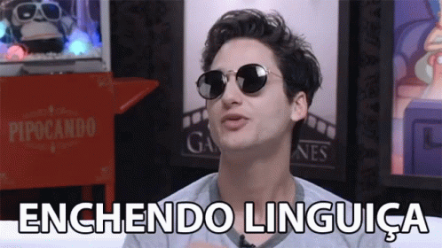 A man in sunglasses says 'Enchendo Linguiça,' an idiom for wasting time or stalling, in a humorous clip.
