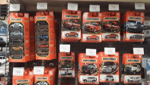 A wide selection of Matchbox die-cast cars displayed on shelves in a retail store.