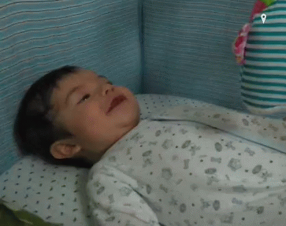 Happy baby Mateo smiles and coos while lying in his crib, looking at a colorful toy.
