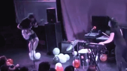 Math The Band performs live, with a guitarist and keyboardist on a stage filled with balloons.