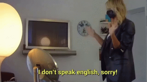Matilde Brandi, wearing a black jacket and mask, gestures while saying "I don't speak English, sorry!".