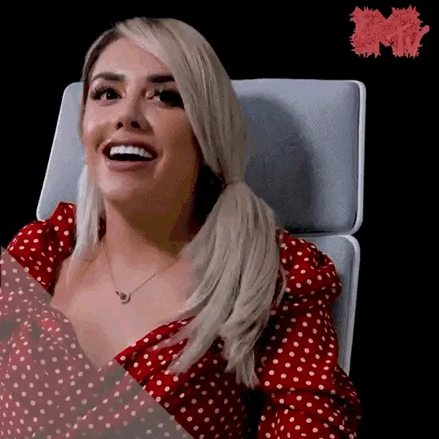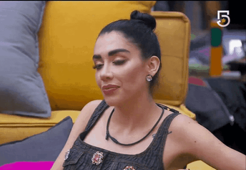 Karime Pindter from La Casa de los Famosos, part of Matrioshka Team Mar, sitting on a yellow couch.