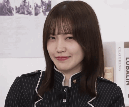 a woman wearing a black striped jacket is standing in front of a wall with a book titled clothing