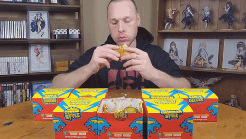 Matt Attack enjoys a massive MrBeast Burger mukbang, surrounded by burger boxes.