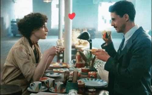 Matthew Goode and Phoebe Dynevor share a charming tea moment, with a 'love it' animation appearing above them.
