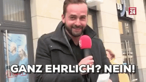 Matthias Kernstock holding a microphone, saying 'Honestly? No!' in Dresden.