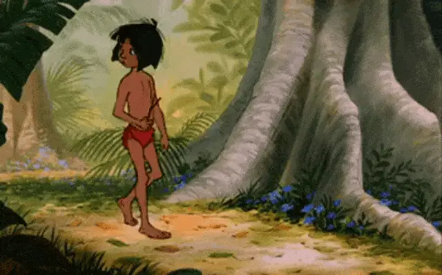 Mowgli's black panther friend Bagheera playfully interacts with butterflies in the jungle.