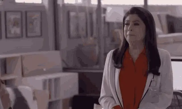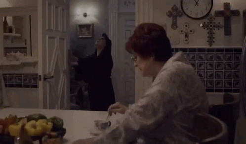 Maura Victoria Ruffo in a kitchen, looking up and then moving to the counter while another woman sits at the table.