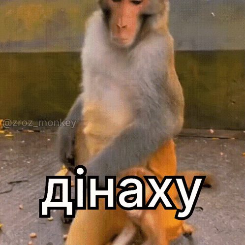 A monkey sitting with the Ukrainian word 'DINAKHU' displayed on the screen, appearing to interact with something on the ground.