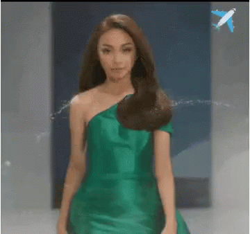 May May Entrata gracefully walks the runway, showcasing a stunning green one-shoulder dress.