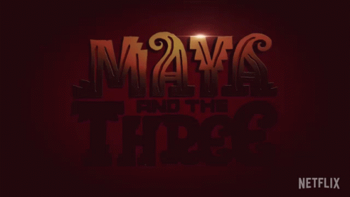 The animated title card for 'Maya And The Three', featuring golden text on a dark red background, from Netflix.