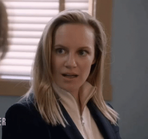 Maya Bishop (Danielle Savre) looks surprised and confused, mouth slightly open, wearing a dark blazer.