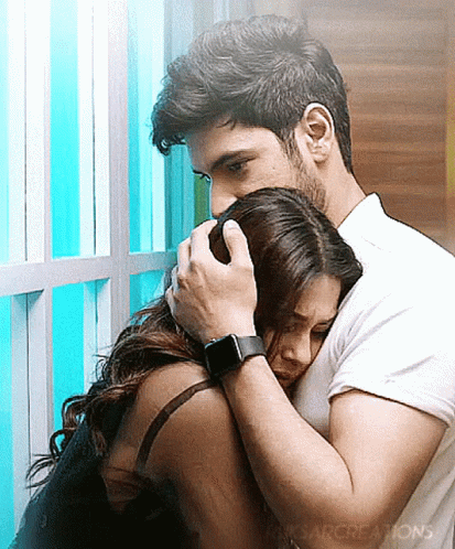 Maya Jai Singh and Rudra Roy share an emotional hug, with Rudra comforting Maya in a tender moment.