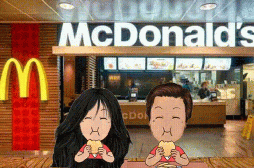 Maydon and a friend, depicted as animated characters, enjoy sandwiches in front of a McDonald's restaurant.
