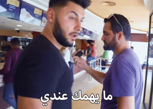 Two men in a restaurant, one looking at the camera with the Arabic caption "Don't worry, I got it."