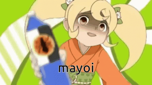 Hiyoko Saionji from Danganronpa in a kimono, with the text 'mayoi' and 'decision' displayed.