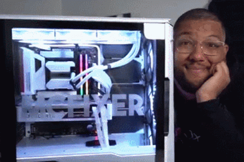 MC Fixer proudly displays his custom-built PC with white components and vibrant RGB lighting.