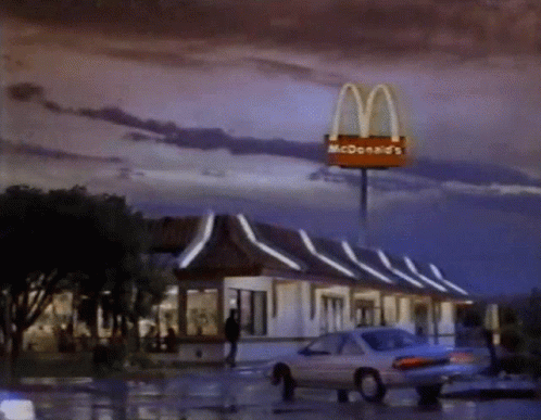 A classic McDonald's restaurant exterior at night, showcasing its iconic golden arches during the 1990s.