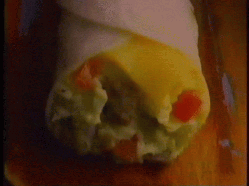 Close-up of a classic 90s McDonald's Breakfast Burrito, featuring ingredients like guacamole, cheese, and tomatoes.