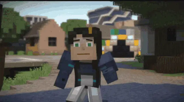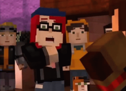 A group of Minecraft Story Mode characters stand together, engaged in conversation.