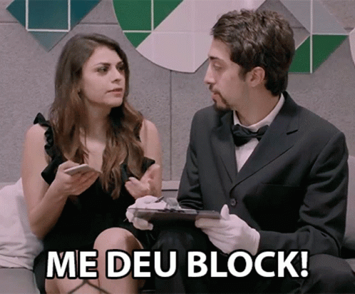 A woman is upset, exclaiming "He blocked me!" while talking to a man in a suit.